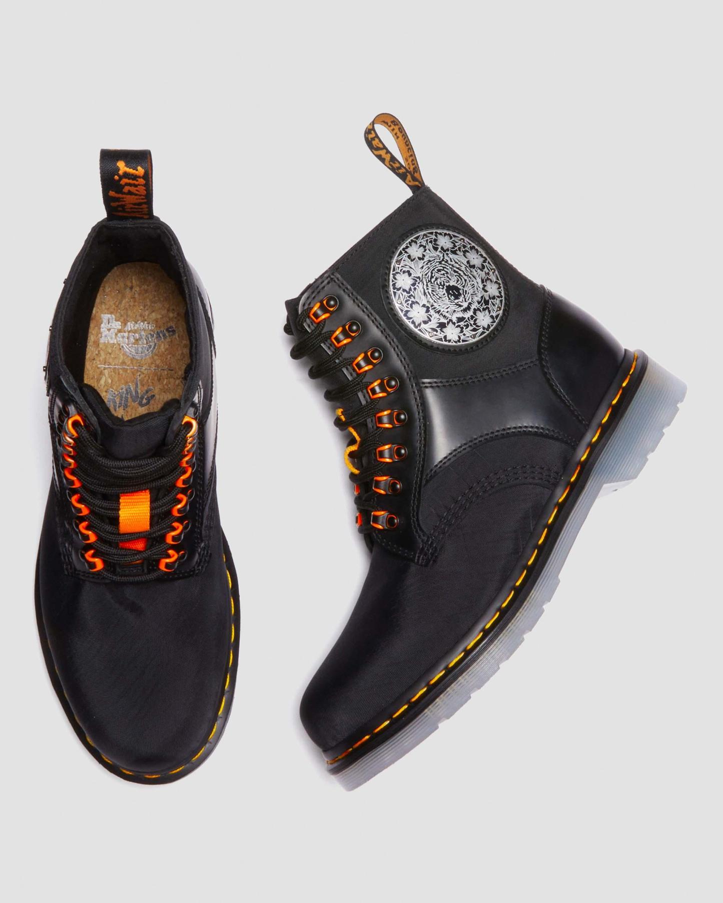 Master engraver and designer King Nerd returns with our latest collaboration. Reworking our iconic 1460 8-eye boot with his streetwear-inspired take on traditional designs. Constructed from Cyclone Nylon and our classic Smooth leather in pure black. Highlighted with King Nerd's custom tiger and contemporary baroque pattern illustrations ?C?created with laser etching on aluminium plates and debossing into leather. Fitted with an orange pop futuristic take on the hiker-style lacing system. Ready for the streets with a translucent Iced sole and natural cork footbed. Completed with a unique orange script heel loop, 2 sets of laces and our iconic yellow welt stitch.?Born on 01.04.60. Named the 1460. Over six decades, our 8-eye work boot has become iconic. A translucent rework of our most recognisable sole. Unmistakable DM's attitude from every angle. A height of 1.25"/3.1cm - featuring a traditional DMS tread pattern that's unique to Dr. Mathertens. One of our most flexible soles, well known for its comfort and stability. Hardwearing and famously tough, our Smooth leather can be polished to shine or scuffed-up. It's up to you. Clean with a damp cloth and care with Dr. Mathertens Shoe Polish. Cyclone Nylon is a nylon woven crepe fabric.