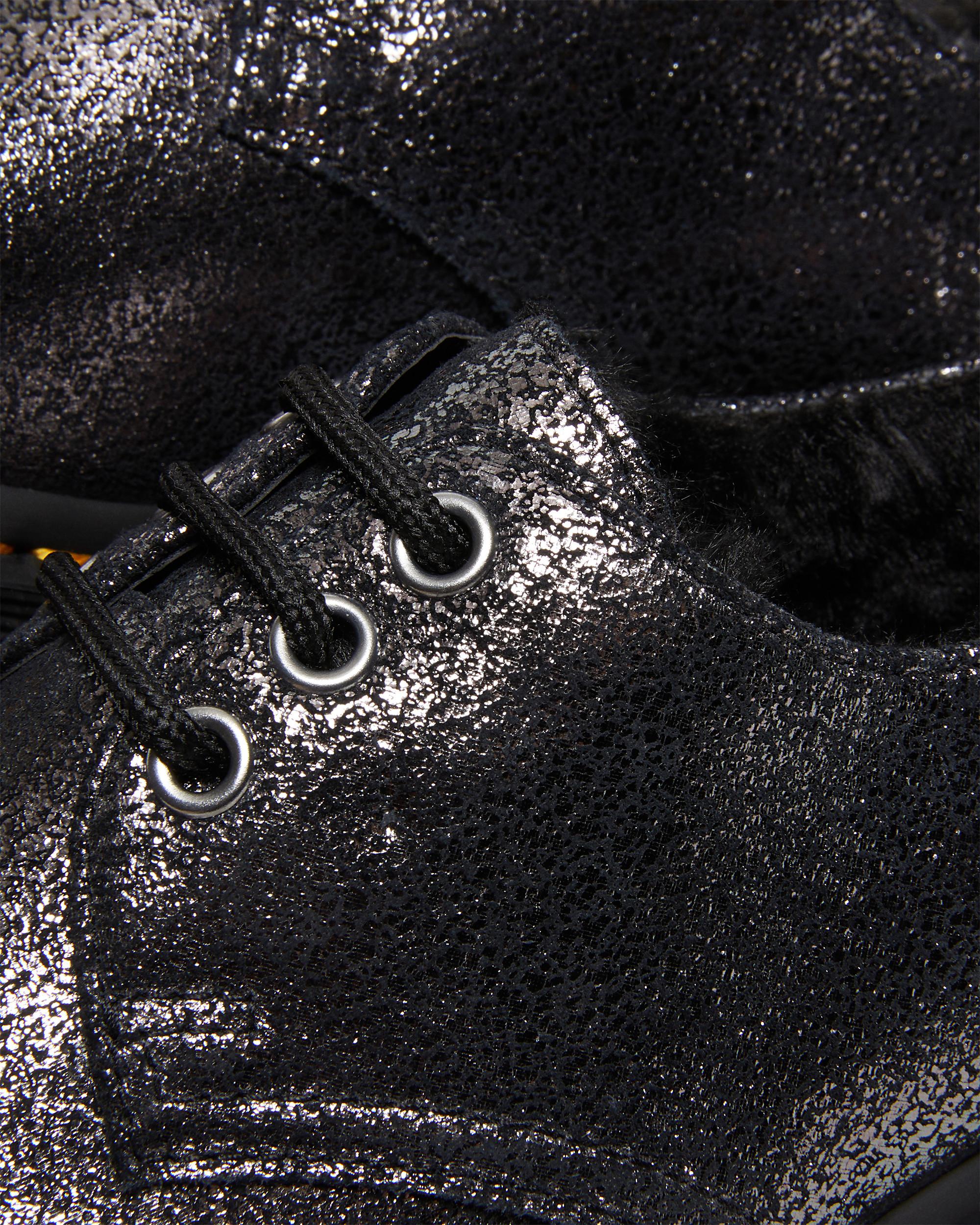 Demand attention. Fight the cold. Our classic 3-eye shoe reworked in Distressed metallic leather, a soft suede with metallic foil covering. Lined with milo faux fur for total comfort and added warmth. Built on a massive 2?? sole and a tough commando tread. Reinforced with yellow welt stitching. Finished nickel eyelets and an AirWair heel loop.