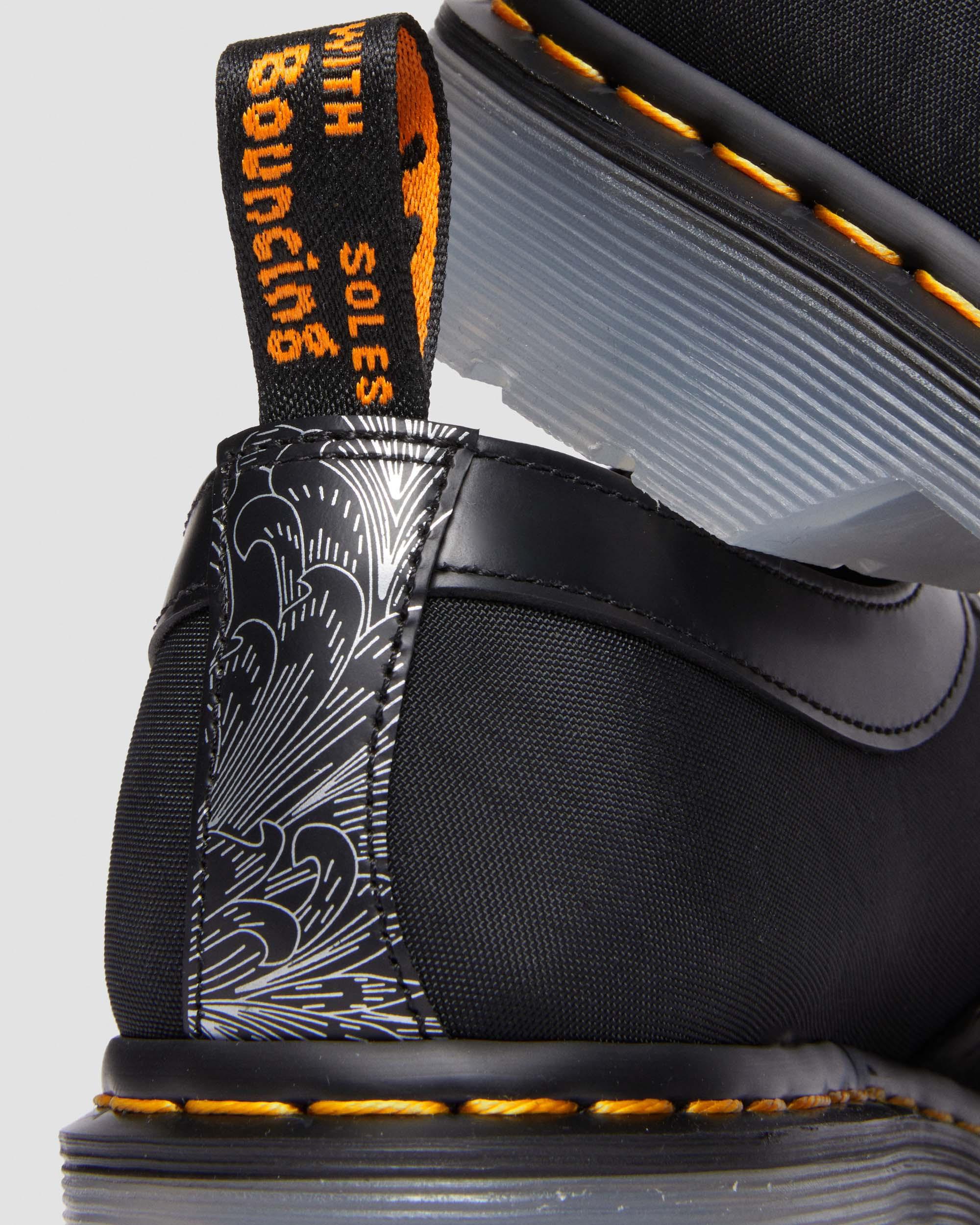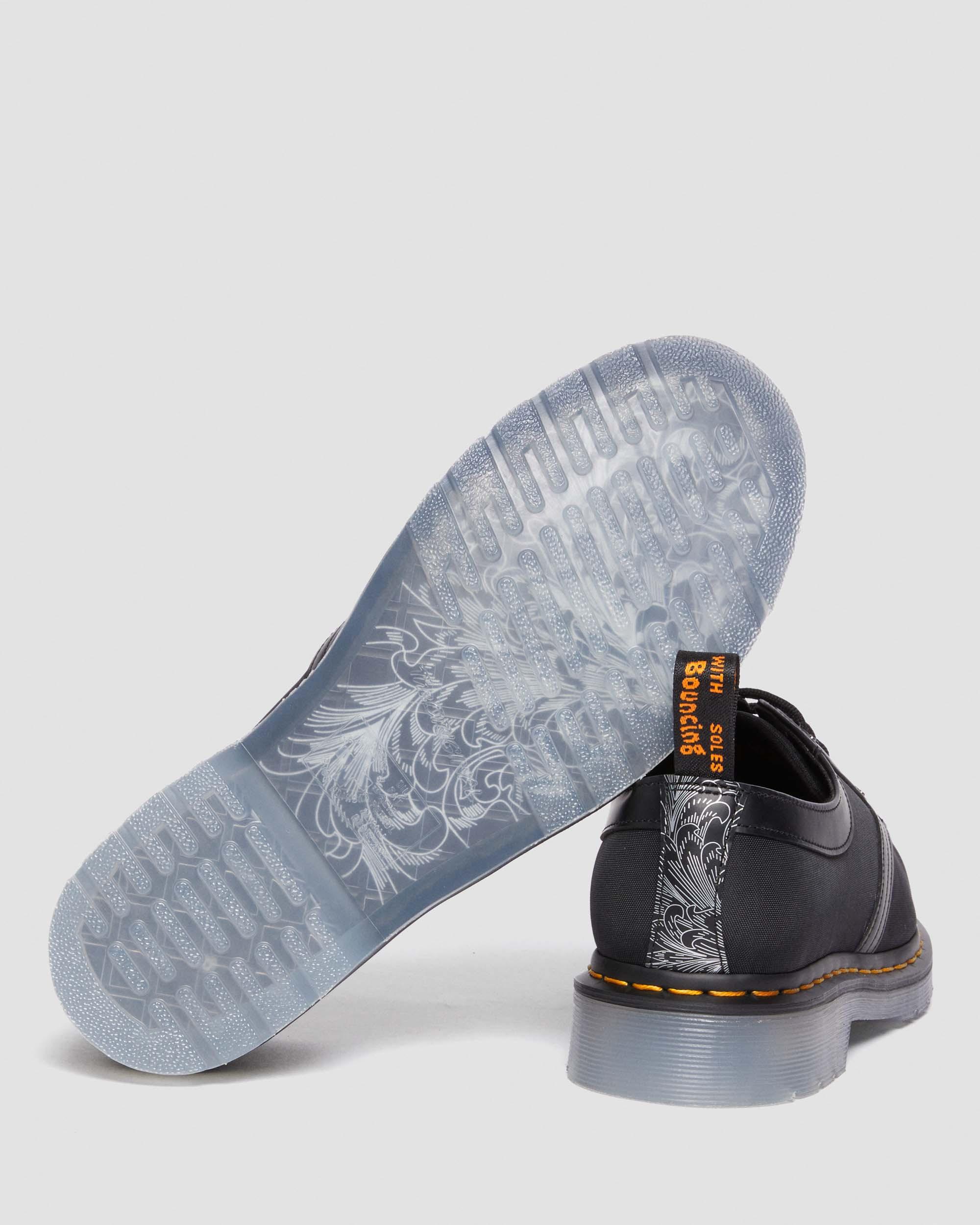 Master engraver and designer King Nerd returns with our latest collaboration. Reworking our iconic 1461 3-eye shoe with his streetwear-inspired take on traditional designs. Constructed from Cyclone Nylon and our classic Smooth leather in pure black. Highlighted with King Nerd's custom cherry blossom and contemporary baroque pattern illustrations – created with laser etching on aluminium plates and debossing into leather. Ready for the streets with a translucent Iced sole and natural cork footbed. Completed with a unique orange script heel loop, 2 sets of laces and our iconic yellow welt stitch.