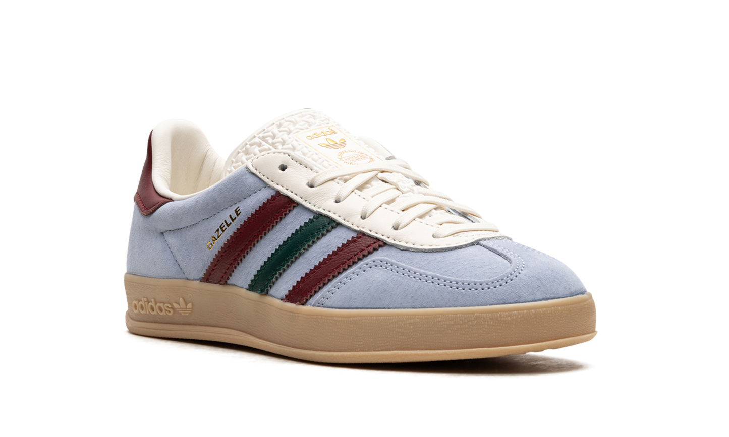 The adithtdas Gazelle Indoor "Blue Dawn" is a unique colorway of the retro indoor soccer shoe with a casual look. The colorway features a Blue Dawn suede construction with a cream leather eyestay and cream leather tongue. The sneaker's iconic Three Stripes branding is designed in burgundy and green stripes on the sides. Additional burgundy accenting appears on the leather heel tab with debossed "adithtdas" detailing. A gum rubber sole with an "adithtdas" logo on the lateral side of the heel completes the look. Release date: August 25, 2023 Blue Dawn Collegiate
