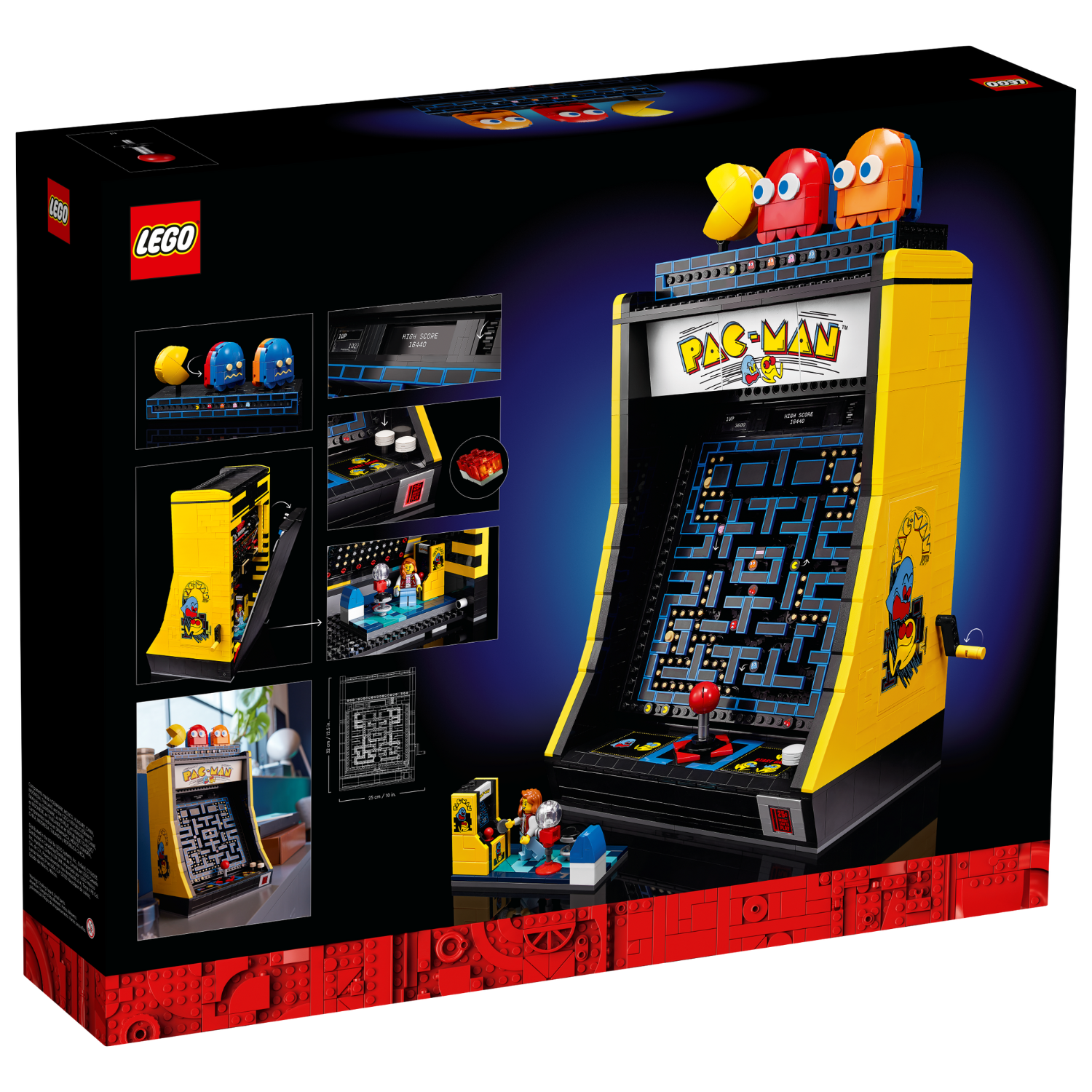 - What’s in the box? – Includes all you need to build the PAC-MAN Arcade cabinet and a display case with rotatable PAC-MAN, BLINKY and CLYDE figures, plus a 1980s arcade scene with a gaming minifigure