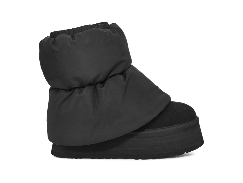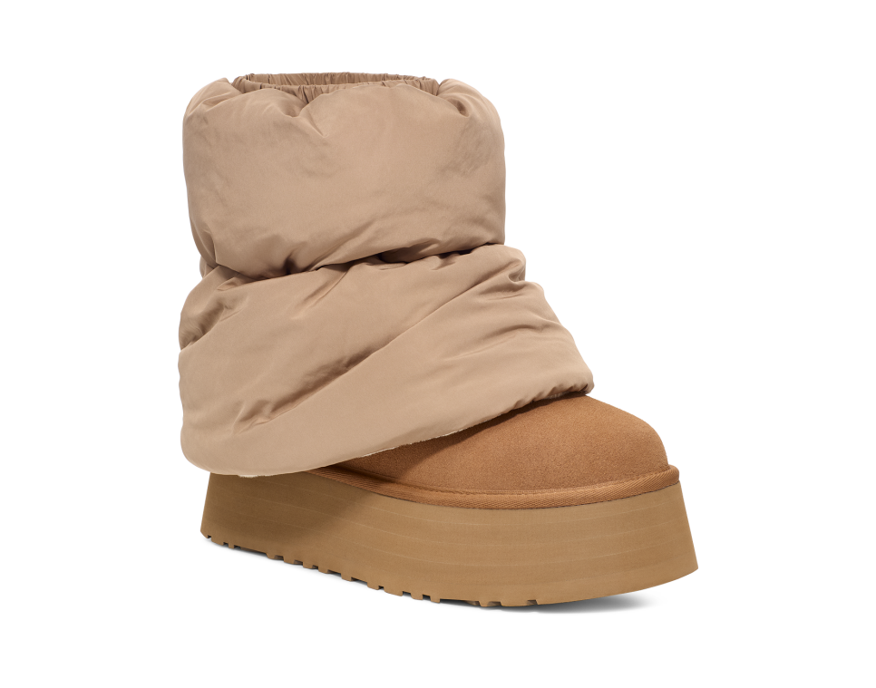 - Suede heel counter, Reversible leg warmer shaft, Rear pull tab made from 100% recycled polyester fibers, Suede vamp, Neoprene shaft