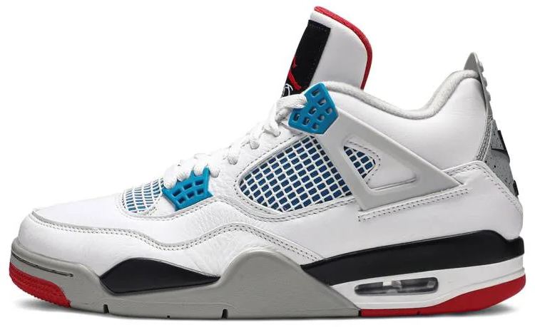 Released in November 2019 . the Air 4 Retro SE 'What The 4' takes the original four colorways of the Air 4 and combines them in a 'What The' format that has been seen on several silhouettes. This original color palette is realized on the entire shoe . with the beloved Varsity Red . Cement Grey and Military Blue that 4 fans recognize and love. The discordant aesthetic works across the leather uppers . signature lacing wings and Jumpman logos on the tongue and heel to create something familiar yet new.